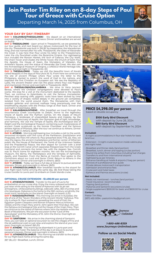 Join Pastor Tim on an 8-day Steps of Paul Tour of Greece with an optional cruise.
